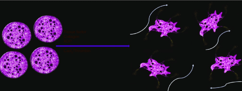 See above: Platelets in their natural state (left) and in pseudopodial shape (right).